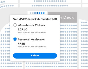 Personal Assistant tickets are only available through the venue’s official ticketing partner AXS, and no other ticket agents. PA tickets must be booked with Accessible Tickets. If this isn’t chosen at the time of booking, then adding a PA later may not be possible. Our policy states that the PA must sit next to the accessible guest, and if no PA is chosen at the time of booking, the seats next to you may get sold.