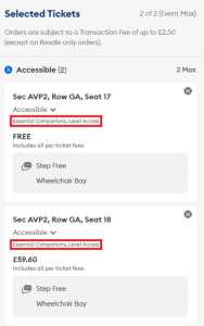 4. Click ‘Checkout’ and complete your booking in the usual way. Please check your booking before paying, a summary of the tickets that you have put into your basket and make sure they are wheelchair accessible by looking for “level access” as some spaces in front balcony are not dedicated wheelchair bays (example below).